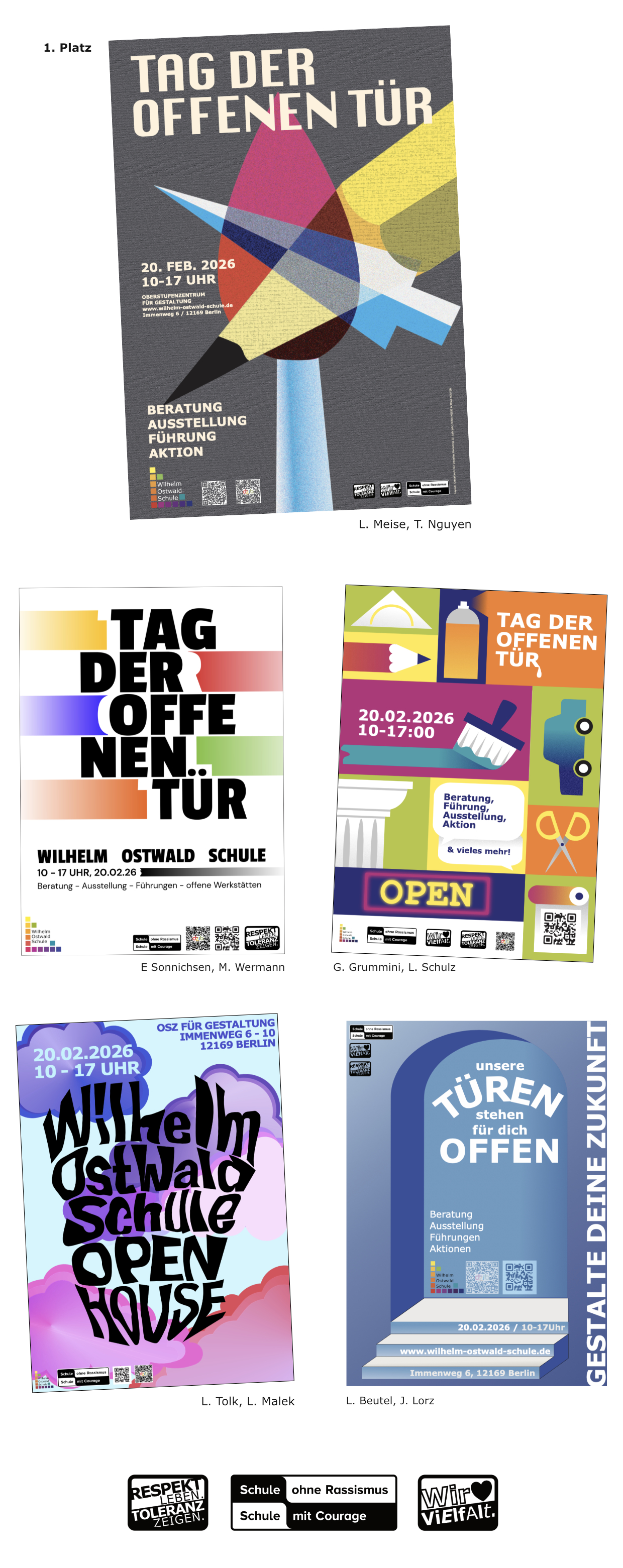Auch in diesem Jahr haben engagierte Schülerteams kreative Entwürfe für das Plakat und den Flyer (Tag der offenen Tür 2026, 20.02., 10-17Uhr) unserer Schule gestaltet. Die fünf besten Arbeiten wurden ausgewählt und der Schulleitung vorgestellt. Die Entwürfe wurden von den Gestalter*innen für visuelles Marketing 3. Ausbildungsjahr erstellt.