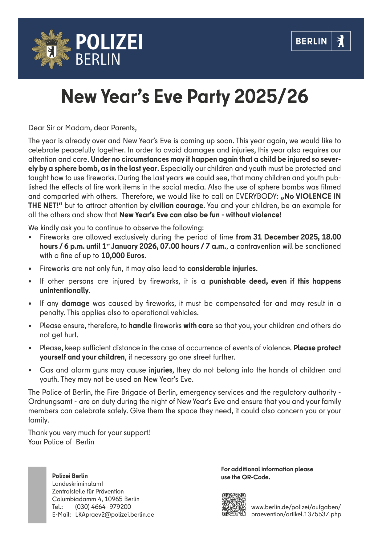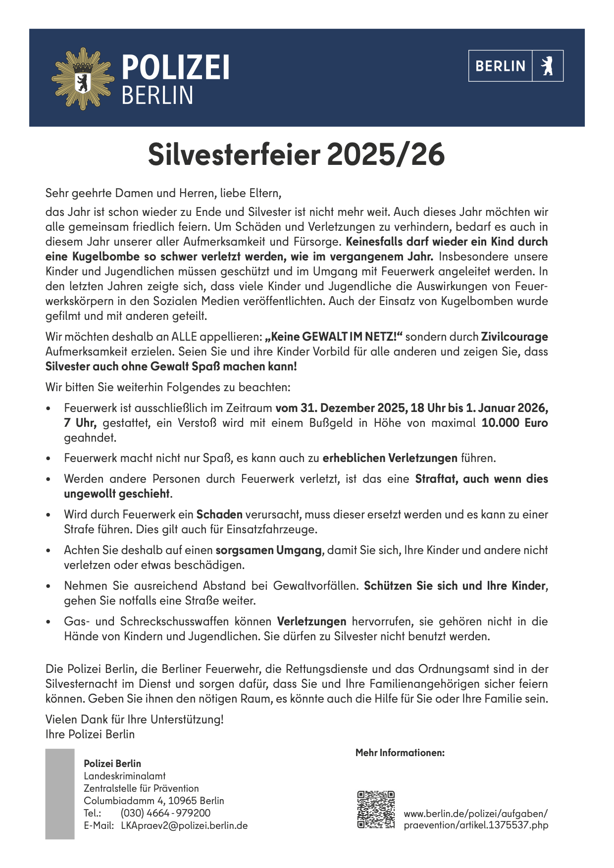 Im Anhang findet ihr noch einen Hinweis der Polizei zum Thema: „Silvester feiern – mit Respekt und Umsicht.“
